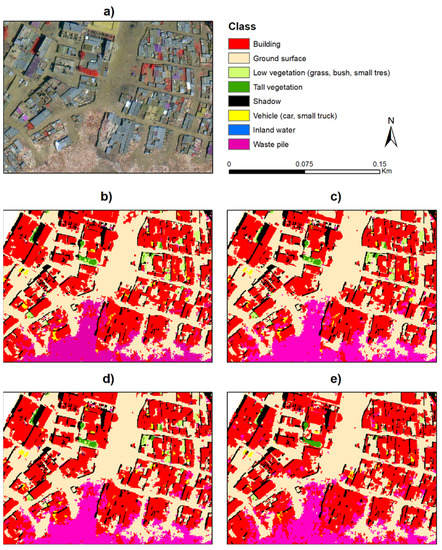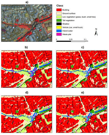 LC maps in the Uboja community, which contains a remarkable amount of waste piles. (a) WV-3 false-color composite. LC predictions using (b) all available bands (WV-3 8 MS bands and 8 SWIR bands), (c) WV-3 8 multispectral bands, (d) WV-3 RGBNIR bands, and (e) WV-3 RGB bands.