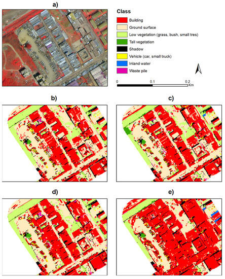 Snippet of the LC models predictions in an area in Mathare, Nairobi. (a) WV-3 false-color composite. LC predictions using (b) all available bands (WV-3 8 MS bands and 8 SWIR bands), (c) WV-3 8 multispectral bands, (d) WV-3 RGBNIR bands, and (e) WV-3 RGB bands.