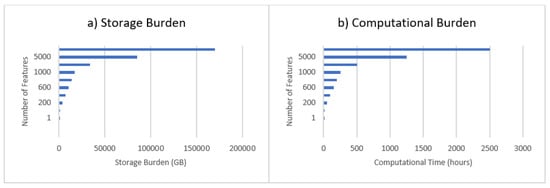 The effect of FS in large-scale applications is not only reflected in the reduced training time of the machine learning models, but also in the time reduction in the feature engineering process. For instance, computing a single texture (on a three-by-three kernel window) over the study area, requires roughly 15 min of processing time (on a single processing thread) and requires about 17 gigabytes of space as a GeoTiff file. This being the case, it would require massive amounts of time and storage space to deal with such an application if the number of features was multiplied to a few dozen. Running an LC model across a study area with 5000 features would require more than 2000 h of processing time and more than 15,000 GB of storage space (Figure 8). Alternatively, by focusing on computing large numbers of features only in the training data locations, as in this study, we can exponentially reduce the computational burden, efficiently select the most discriminant features, and use only them on the rest of the study area.