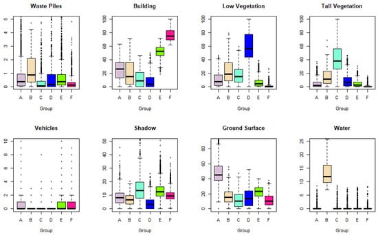 Notably, there is a clear signature in each morphological cluster with respect to its LC distribution (Figure 11). The clusters from A to D represent low-density areas of the settlements, usually located at the edge of the neighborhood or on the main streets, while groups E and F represent high-density, built-up areas. For instance, group F is associated with extremely high building density and an almost complete absence of vegetation, while group E, although densely built, contains significantly taller buildings, i.e., a higher value of shadows as well as more vegetation and open space. Cluster A stands out for having the highest presence of ground surface. Cluster B is associated with the presence of large proportions of garbage and water areas. Cluster C is defined by having the greater presence of tall trees as well as shadows. Most zones in Cluster D are low-vegetation, and the presence of buildings in them is almost non-existent.