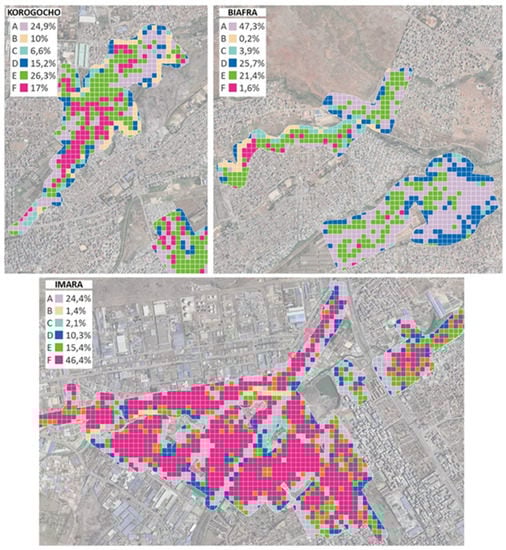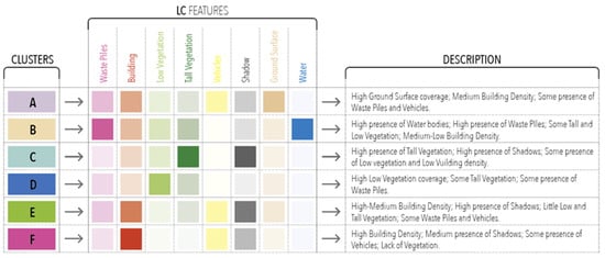 Six clusters (A to F) were produced to show land-cover differences across (inter-DUA) and within (intra-DUA) settlements. Each cluster is defined by different proportions of the eight LC features: waste piles; building; low vegetation; tall vegetation; vehicles; shadow; ground surface; and water. As shown in Figure 9, each LC class is reflected in different proportions within each morphological cluster. Figure 10 demonstrates examples of grid cells (50 m × 50 m) that belong to these clusters, both on the satellite image and respective LC map.