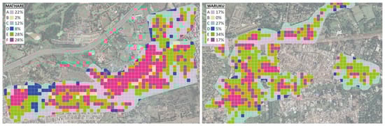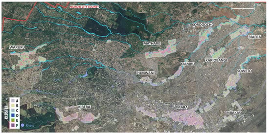 The spatial arrangement of the clusters is also a point of interest. For instance, Mathare and Waruku show similar proportions of each cluster but differ significantly in their spatial distribution (Figure 13). In the former cluster A (open space, streets, and built-up to a low degree) is more widespread, while in the latter it only follows the central street network, indicating a less-developed street network and fewer open spaces.