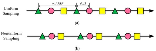 where denotes the velocity of the SAR carrier, represents the number of the channels, and is the displacement between the adjacent receivers, then the uniformly sampled azimuth signal can be generated by simply rearranging the MCSAR echo. However, PRF is difficult to satisfy the uniform sampling condition in azimuth MCSAR system design. Non-uniform sampling will cause azimuth Doppler ambiguity in the echo signal received by each channel. The comparison between uniform sampling and non-uniform sampling has been shown in Figure 1, where a triangle, a circle and a square represent the echo signal received by the first channel, the second channel and the third channel, respectively. If azimuth multi-channel SAR echo data are directly imaged without reconstruction, the quality of the image will be greatly reduced. Therefore, to achieve unambiguous images, Doppler spectrum reconstruction is necessary.