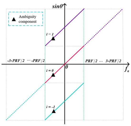When the PRF is higher than the Doppler bandwidth of each channel echo, each Doppler frequency unit contains numerous scene echo signals with the same cone angle , that is, the Doppler frequency has a linear relationship with the cone angle [29,30], i.e.,