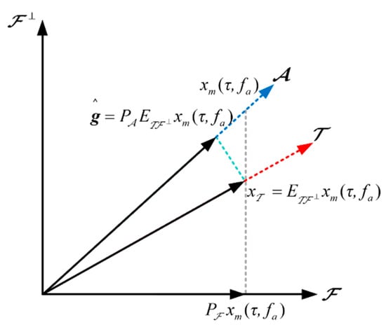 As discussed in Section 3, in the case of highly non-uniform sampling, the SNR of the DBF algorithm would be severely reduced. To solve the above problem, this section proposes the TSPT algorithm based on the idea of sparse uniform resampling. The TSPT algorithm reconstruction process consists of two steps in Figure 4. The first is to project the azimuth multi-channel SAR signal obliquely to [26]. It can recover a consistent approximation of in , denoted . In this case, consistency means that the original sample will produce . The second projection is to orthogonally project the result of the first projection onto . This projection restores the signal closest to the signal in . Using a digital LSI filter can achieve the secondary projection and generate evenly spaced signal values. The introduction of intermediate subspace can achieve low computational complexity and keep the approximation error.