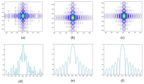 Point target simulation. (a) DBF. (b) IDBF. (c) TSPT. (d) Azimuth profile corresponding to (a). (e) Azimuth profile corresponding to (b). (f) Azimuth profile corresponding to (c).
