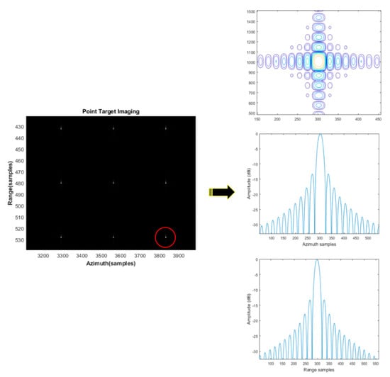 (Left) Mutiple point targets imaging. (Right) Edge point target contour map, azimuth profile, and range profile.