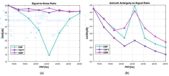 To verify the performance of the proposed method, this section gives a comparison experiment on the SNR and AASR of the DBF algorithm, the TSPT algorithm, and the IDBF algorithm. For the calculation method of the SNR of the TSPT algorithm, refer to [26], and for the calculation method of AASR, refer to [25,35]. For each PRF in the interval of [1495–2803] Hz, we generate azimuth three-channel SAR data according to the parameters shown in Algorithm 1. Then, the DBF algorithm, the TSPT algorithm, and the IDBF algorithm were used to process the data of the three channels. Figure 8 shows the SNR and AASR of the three methods calculated for different PRF values. It can be seen from Figure 8a that the SNR of the DBF algorithm, TSPT algorithm, and IDBF algorithm are consistent under uniform sampling. It can be seen that when the system PRF deviates from the uniformly sampled PRF, the SNR of the DBF algorithm will drop sharply. For PRFs close to coinciding with PRF, the DBF algorithm has a quite low SNR compared with the TSPT algorithm and the IDBF algorithm.
