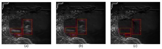 In this experiment, three typical areas were selected for comparative analysis, as shown in the red box in Figure 9. Figure 9a presents the imaging result using the DBF algorithm to reconstruct the azimuth signal. It can be seen that the serious azimuth ambiguities are caused by non-uniform sampling and noise. In Figure 9b, the IDBF algorithm reduces azimuth ambiguity, but the imaging result is still not ideal. The imaging result using the proposed algorithm in this paper is shown in Figure 9c. The azimuth ambiguities denoted in red box can hardly be seen in Figure 9c, which means that the proposed algorithm can effectively suppress azimuth ambiguity. By comparing with the conventional algorithm and its improved algorithm, it becomes clear that the azimuth signal of MCSAR is well reconstructed based on the proposed algorithm.