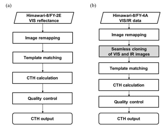 A flowchart of the prototype dual-GEO CTH algorithm is shown in Figure 1a.