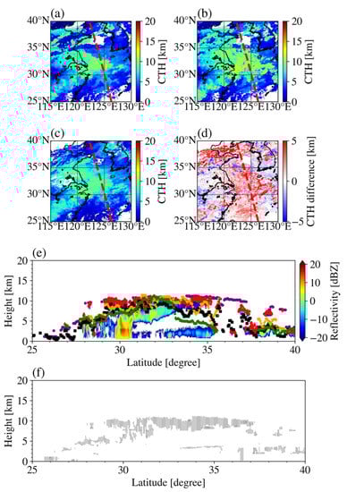 The CPR onboard CloudSat is a 94-GHz nadir-looking radar that measures signal backscattered from hydrometeors [7,8]. This instrument samples 688 pulses to produce a single profile every 1.1 km along the track. Each CPR profile has 125 vertical bins, and each vertical bin is 240 m thick. The footprint of a single profile is 1.7 km (along the track) by 1.3 km (across the track). The CPR is highly sensitive to large cloud particles and exhibits a low sensitivity to small cloud particles. Consequently, this instrument can provide information regarding the vertical structure of the cloud. In this study, the CPR level 2 geometric profile data product of the CloudSat Data Processing Center (http://www.cloudsat.cira.colostate.edu accessed on: 24 October 2021) was adopted. This dataset provides the cloud mask values assigned to each vertical bin. Herein, the CPR bins with cloud mask values greater than 30 are considered as cloud layers [30], and the highest level of the cloud layers is defined as the CPR CTH.