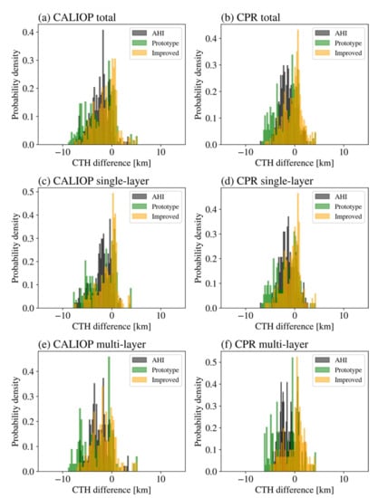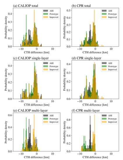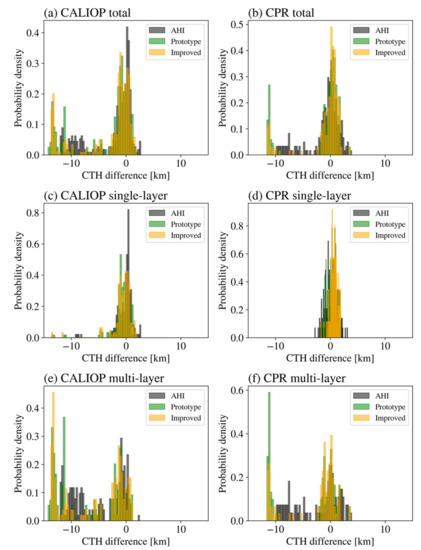 Figure 6a,b respectively present the probability densities of the CTH differences pertaining to the three CTHs from the AHI (black), prototype dual-GEO CTH algorithm (green), and improved dual-GEO CTH algorithm (orange), and the CALIOP/CPR CTHs for this case. Retrievals were considered when the AHI, prototype dual-GEO CTH algorithm, and improved dual-GEO CTH algorithm, as well as the CALIOP/CPR, provided CTHs. The numbers of comparison datasets for the CALIOP and CPR CTHs were 489 and 413, respectively. The improved dual-GEO CTHs were more similar to the CALIOP/CPR CTHs compared to the previous dual-GEO CTHs. To further investigate the CTH behaviors for different numbers of cloud layers, the cloud cases were separated into cases with single-layer and multi-layer clouds considering the number of layers in the CALIOP level 2 data. Figure 6c,d shows the results of the single-layer clouds for the CALIOP (249 comparison pairs) and CPR (249 comparison pairs), respectively. Figure 6d,e shows the results of the multi-layer clouds for the CALIOP (240 comparison pairs) and CPR (164 comparison pairs), respectively. As expected, the proposed algorithm achieved superior results for the multi-layer clouds compared to those obtained using the prototype algorithm. Moreover, the improved dual-GEO CTHs were more similar to the CPR CTHs than the CALIOP CTHs.