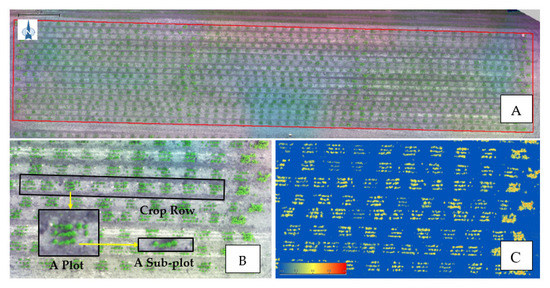 (A) The lentil breeding trial within field boundary (red) in RGB color. (B) Subset of the orthomosaic showing sample crop row, plot, and sub-plot. (C) Excess green vegetation index (ExG) map of the subset.