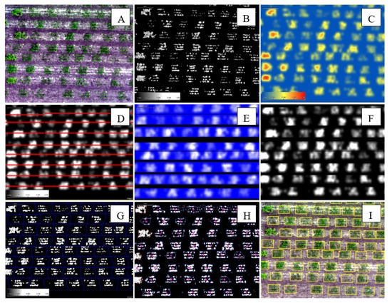 RGB imagery (Figure 3A) is used to generate the ExG map (Figure 3B). Convolution filter (Gaussian) in window sizes range from 5 × 5 to 50 × 50 with the accumulative step of 5 × 5 pixels was conducted in a loop on ExG map. The output of the ExG convolution filter map (hereafter ExG_convo) is a raster layer map, as in Figure 3C. A greenness area mask (ExG_mask) was also created using a multi-thresholding algorithm on ExG, with a threshold value greater than 0 (ExG > 0). Map rotation was conducted (−1.45°) to align the crop rows horizontally and to facilitate the next steps.