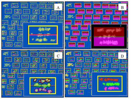 Example to illustrate sub-plot extraction from plot boundary and ExG index. (A) Plot center and middle line. (B) Plot regions—middle, top, and bottom. (C) Watershed segmentation output. (D) Final sub-plot boundary map layer.