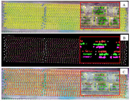 The output maps of (A) plot boundary (yellow boxes). (B) Sub-plot map showing individual rows separated by color. (C) Vector maps (plot and sub-plot) of the whole experiment. The magnified regions are in the red boxes.