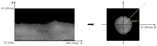To extract biological information from weather radar images, we first render and map the original radar data into rectangular coordinates, so as to artificially identify the difference between biological and precipitation echoes from the geometric shape. Specifically, raw radar data products are stored in polar coordinate, including range bin and azimuth information. Considering that bird migration occurs at a lower altitude, typically, between 0.4 and 2 km [11,24], we select the first 200 range bin data, which corresponds to the altitude detection range of 0–2 km, to generate an image in polar coordinates. The image is then mapped to rectangular coordinates by Equation (1), and a radar image with a resolution of 320 × 320 is obtained through linear interpolation. In our radar image, the X-axis represents the east–west direction, the Y-axis represents the north–south direction, and the radar is located in the center of the image. Figure 2 shows the process of mapping a radar reflectivity data in polar coordinates to rectangular coordinates.