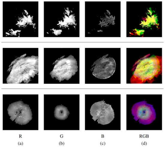 - Primarily visible in the red and green channel. Precipitation echo can extend to several kilometers in the vertical direction [34] while being scanned by weather radar at all elevation angles, and the echo intensity can exceed 50 dBZ [11,28]; thus, the red and green channels of the rendered image have strong gray values. In addition, in environments without biological echo pollution, including isolated tornado storms, the echo spectrum width is usually lower than 2 m/s [31,32], meaning the third channel tends to have a black background.