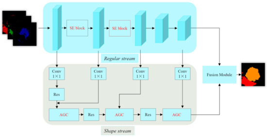 Gated-SCNN [37] is an advanced semantic segmentation network model currently, which constitutes of two main streams, i.e., the regular stream and the shape stream. The architecture can produce sharper predictions around object boundaries. Our model draws on this network structure and makes the following improvements: