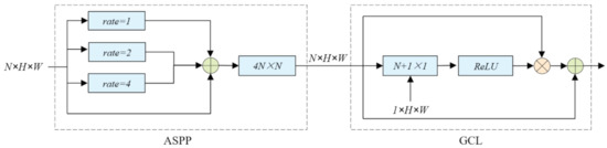 We integrate ASPP block based on GCL module to build Atrous Gated Convolution (AGC) module, helping the network understand the global shape information of the target. The proposed module is shown in Figure 8.