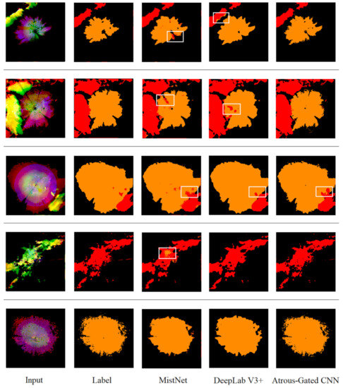 In addition, we qualitatively evaluate the performance of different networks through the segmentation results on the same image. Figure 10 compares the predictions of MistNet, DeepLab V3+ and our method on several samples, where the white box represents the pixel areas with obvious segmentation errors. Because the input format of MistNet is an image with 15 channels, which is different from ours and the basic framework of MistNet is FCN, we use the prediction results of FCN-8s to represent MistNet. The result of Gated-SCNN is similar to that of Atrous-Gated CNN, which will not be shown here. Atrous-Gated CNN has fewer prediction errors on five examples, which proves the effectiveness of the proposed method. In the fourth and fifth samples (row 4 and 5) of Figure 10, the edges of the echo are rough and complicated, which means that accurate prediction is challenging. MistNet and DeepLab V3+ have fuzzy predictions on these edges, resulting in smoother edges of the prediction results. In contrast, Atrous-Gated CNN predicts these edges more accurately, and the prediction result is almost the same as the label image, which verifies that shape stream of the network can effectively extract the shape features of the echo.