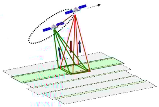 The TH-2 satellite system, which is the first distributed interferometric synthetic aperture radar (InSAR) formation system in China, was sent into space by the Long March-4B launch vehicle on 30 April 2019 [1,2,3]. This formation consists of two almost identical satellites, the TH-2A and TH-2B, which both fly in sun-synchronous orbits (527 km altitude, 97.45° inclination) with a relative distance of 700 m in 2019, as shown in Figure 1. To accomplish the missions of topographic mapping, deformation detection, scientific research, etc., the orbit and baseline accuracy requirements of the TH-2 are 1 m and 8 mm, respectively.
