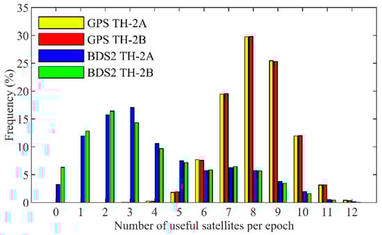 In November 2019, GPS consisted of 32 medium Earth orbit satellites (MEOs), while BDS2 included five geostationary Earth orbit satellites (GEOs), seven inclined geostationary orbit satellites (IGSOs), and three MEOs. Their differences in observation geometry can be reflected by the position dilution of precision (PDOP). When the cutoff elevation angle is set to 5°, the percentage of the epochs with the PDOP of GPS below six is about 99% along the trajectories of the TH-2A and TH-2B, whereas the corresponding percentage for BDS2 is about 60%, which means a weaker observation geometry compared with that of GPS. In addition, as GPS is a global constellation, there is no significant difference in the number of observed satellites in different areas, which is about 7–10, as shown in Figure 3. On the contrary, since the distribution of BDS2 is unbalanced, and most satellites provide service in the Asia-Pacific region from 55°S to 55°N, and 55°E to 180°E [24], the number of BDS2 satellites varies from region to region. The number of BDS2 satellites observed in the Asia-Pacific region is about 8.8, while the number in the Western Hemisphere is only 0–2.