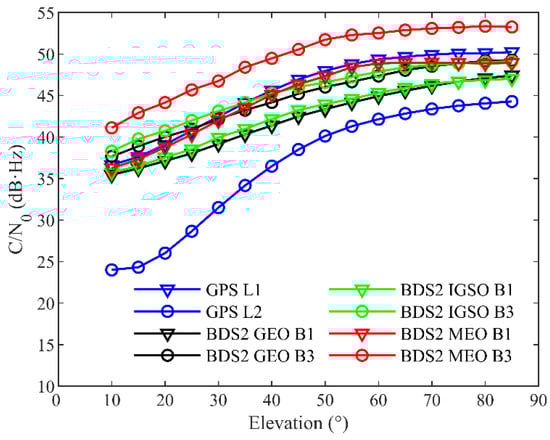 The signal strength can be measured by the carrier-to-noise ratio (C/N0), which shows the ratio of the carrier signal power to the noise power in a 1 Hz bandwidth [25]. Figure 5 indicates that the average C/N0 values of all signals increase as the elevation angle increases. For the GPS, the C/N0 values of the L1 frequency are larger than those of the L2 at all elevations, which is attributed to the differences in their tracking method. For the BDS2, the B3 frequency has about 2–4 dB∙Hz larger C/N0 values than the B1. In addition, it can be noted that the C/N0 values for the MEOs are slightly larger than for the GEOs and IGSOs, which may be due to the higher free-space loss of the GEOs and IGSOs than for the MEOs.