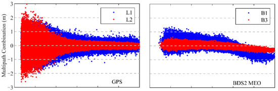 The pseudorange multipath combination (MPC) [26] is an important index to assess the quality of the pseudorange observations. Figure 6 shows the MPCs against the elevation angle of all signals for GPS and BDS2 from the TH-2A. As seen in the figure, the MPCs of the GPS L1 and L2 frequencies are within 3 m, while the MPCs of the BDS2 B1 and B3 are within 1 m in most cases. However, the elevation-dependent systematic bias can be noticed in the pseudorange observations of the BDS2 GEOs, IGSOs, and MEOs, which may be due to the satellite design [27,28]. The MPCs characteristic for the GEOs are close to that for the IGSOs. The systematic variations of the B1 frequency for the BDS2 MEOs are more obvious than those of the other signals, which exceed 1 m close to the zenith. To avoid the precision degradation of the pseudorange caused by systematic biases, an elevation-dependent piecewise linear model, as proposed by Wanninger [27], is applied to compensate for such bias in the BDS2 observations. The RMS of the MPCs for the BDS2 B1 and B3 frequencies are 0.20 and 0.13 m after the correction of the pseudorange observations, while the GPS L1 and L2 frequencies are 0.29 and 0.24 m. The results show that the pseudorange observations for BDS2 achieve a better quality than those for GPS.