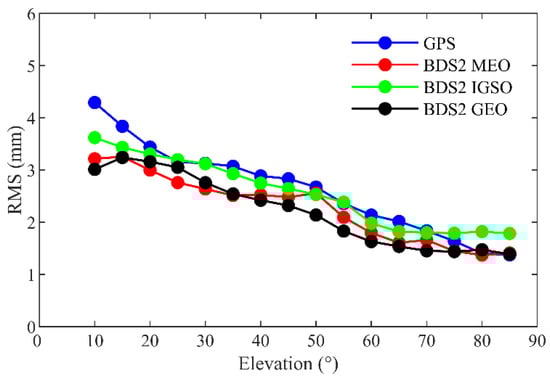 In the POD processing, the weight of carrier phase is greater than that of the pseudorange. Therefore, its quality is important for the POD accuracy of LEOs. The geometry-free combination [29] is adopted to assess the noise level of the carrier phase observations: , where and are the carrier phase measurements from two frequencies. This combination only contains ionospheric delays, initial ambiguities, and noises from the two frequencies. Furthermore, the ionospheric delays and ambiguities are eliminated by a three-order sliding polynomial, and the remaining residuals are considered as the noises of the carrier phase observations. The average RMS of the noises for the GPS is 3.1 mm, while those for the BDS2 MEOs, IGSOs, and GEOs are 2.5, 2.9, and 2.5 mm, respectively. Figure 7 shows the noise levels for the GPS, and BDS2 decrease as the elevation angle increases. The RMS of the noises are smaller than 5 mm, which indicates the good quality of the carrier phase observations.