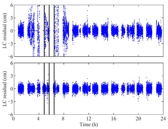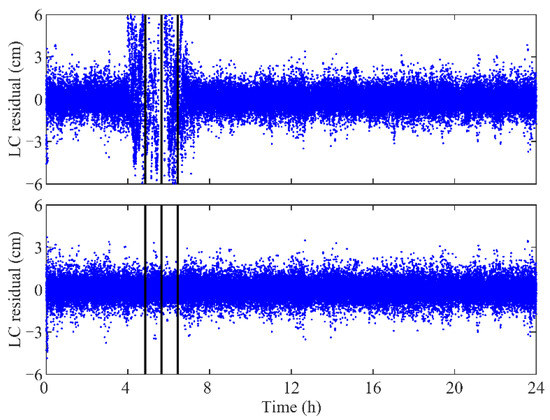 LC residuals of GPS-based POD for TH-2A without maneuver estimation (top panel) and those with maneuver estimation (bottom panel) on DOY 314, 2019. The vertical bars denote the centers of the thrust execution periods. Residuals beyond ±6 cm are not shown in the top panel.