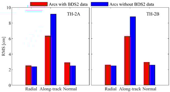 Figure 12 shows the daily RMS of the orbit differences between the BDS2- and GPS-based POD. The along-track components of the RMS errors are larger than the radial and normal components for each arc. The 3D RMS of orbit differences are all smaller than 15 cm, and the average values are 7.99 and 7.83 cm for the TH-2A and TH-2B, respectively. These results indicate that the precision of the BDS2-based orbits of the TH-2 can achieve a subdecimeter level and satisfies the InSAR mission requirement.