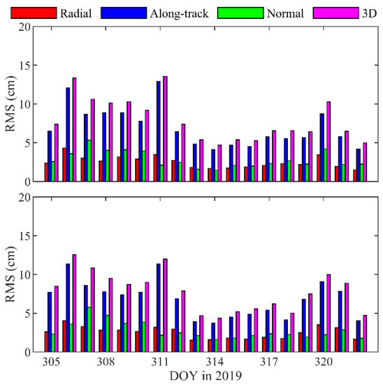 There are about 2.0 h with no available BDS2 IGSOs/MEOs per day. Figure 11 shows the orbit differences between the BDS2- and GPS-based POD during the arcs with and without the BDS2 data. The orbit accuracy with/without the BDS2 data in the radial and normal direction is 2–3 cm. However, the orbit accuracy in the arcs of no BDS2 data in the along-track direction significantly degrades by 42.1% on average.