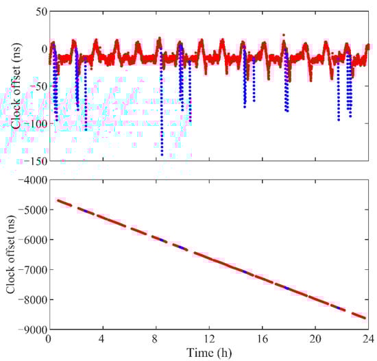 Clock offsets of TH-2A (on DOY 308, 2019) obtained from POD based on GPS observations (top panel) and BDS2 observations without correction (bottom panel). Blue and red points show the estimated clock offsets when radar is in operation and powered off, respectively.
