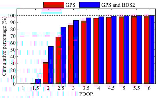 Cumulative percentages of the PDOP values of GPS-only and GPS + BDS2 along the trajectories of TH-2A.