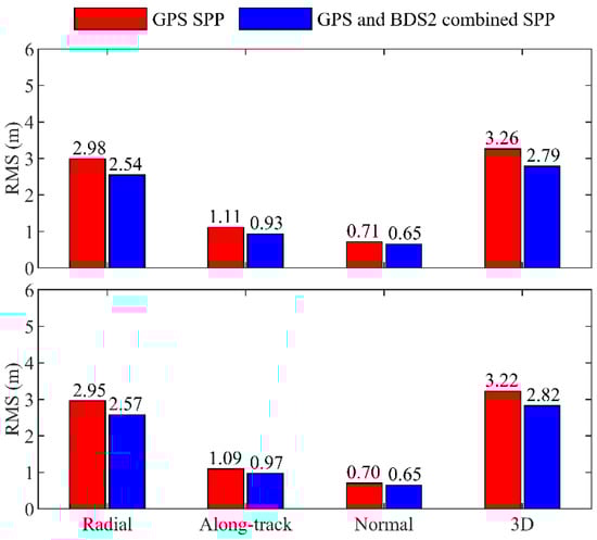 As an important navigation method in real-time satellite orbit determination, single point positioning (SPP) can be used to evaluate the contribution of BDS2 to the LEO orbit determination. By using the GFZ precise ephemeris, the SPP solutions are obtained based on the ionosphere-free pseudorange observations. Table 5 shows the statistics of the orbit differences of the GPS-only and GC combined SPP solutions with respect to the GPS-based POD. The SPP error in the radial is larger than that in the along-track or normal direction due to the uneven distribution of the viewing GNSS satellites in space (i.e., GNSS satellites in the nadir direction cannot be observed). Compared with the GPS SPP solutions, the precision of the GC combined SPP solutions is improved by more than 6% in 3D RMS.