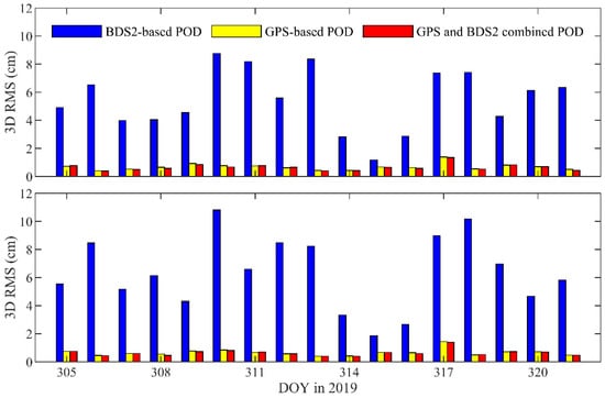 The contribution of the BDS observations for the combined POD is analyzed in this section. The residuals and overlap comparisons are used to assess the orbit precision. Table 6 shows that the values of the residual RMS of the combined POD are close to those obtained by the GPS- and BDS2-only POD, as listed in Table 2. The overlap comparisons of the GC combined POD are smaller than those of the single BDS- and GPS-based POD. Figure 16 indicates that the daily 3D RMS of the overlap differences of the GC combined POD are less than those of the BDS2-only. The overlap comparisons of the GC combined solutions are on average 0.65 and 0.64 cm (3D RMS) for the TH-2A and TH-2B, respectively. Compared with the GPS-based orbits, the precision of the GC combined solutions is only improved by 3–4% in 3D, which is hampered by the precision of the BDS2 precise orbit and clock products [36].