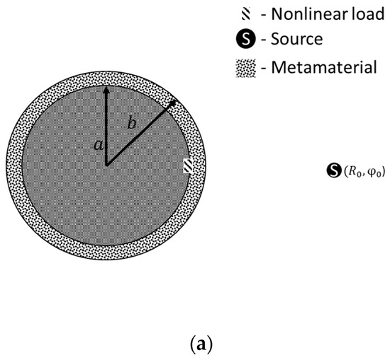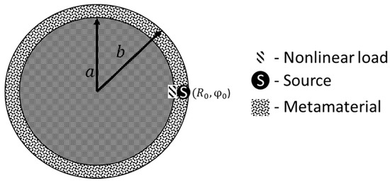 At the first stage, a study of the radiation patterns and scattering of the cylinder with a nonlinear load covered with a MM layer, described in Section 2.3, was carried out. Consider a situation where the source of an excitation is within the metamaterial. The parameters of such calculation are presented in Table 2. The geometry of the problem is shown in the Figure 4.