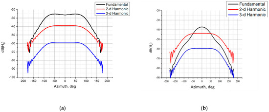 It follows from the figure that the use of MM leads to a narrowing of the pattern at the fundamental frequency and a decrease in the field level by 12 dB. At the same time, the second harmonic level decreased by 5 dB. This made it possible to obtain in a certain sector of angles the values of the second harmonic exceeding the level of the 1st harmonic. The use of the MM layer allows the level of higher harmonics to be equalized with respect to the fundamental frequency in a wide sector of angles, which, in turn, will allow obtaining a gain in the signal-to-noise ratio in the receiver relative to the uncoated case.