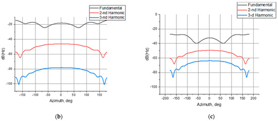 As a result of the program calculation, the radiation patterns of the cylinder were obtained at the fundamental frequency and at the frequency of multiple harmonics (2nd and 3rd) (Figure 5).