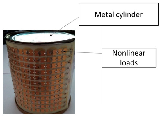 The cylinder with nonlinear loads, covered with a layer of metamaterial, presented in Figure 10, was experimentally studied. The fabrication sample consists of a metal cylinder with a radius of 35 mm with sites for diodes on the upper part of a dielectric substrate made of FR-4 material with a thickness of 0.2 mm. The height of the model of the metal cylinder with nonlinear loads was 120 mm. The 3A206A-6 Schottky detector diodes are included on the seats, which provide the transfer of energy from the frequency of the incident field f1 to the harmonic component 2f1.