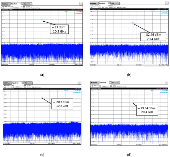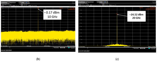 To reduce the difference between the fundamental and the second harmonic, an MM coating, measured earlier, was added. The measurement was carried out with a power input to the horn antenna of 20 dBm (100 mW). To obtain greater accuracy, measurements for the first and second harmonics were carried out in a narrow frequency band (Figure 13).
