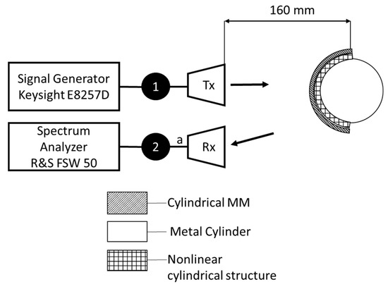 After analyzing the characteristics of the cylindrical MM, the characteristics of the cylindrical MM with nonlinear loads were measured. A nonlinear cylindrical structure with radii of 35 and 45 mm was installed in special holes in frames made of ABS plastic. The scheme for measuring the scattered field is shown in Figure 12.