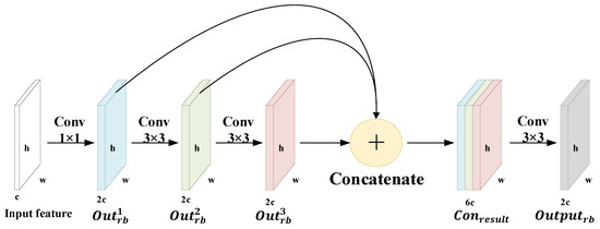 where represents the input feature maps. The outputs of the three consecutive convolutional layers are , , and , respectively. is the concatenate operation. is the result of reusing information, and is the feature extracted from the reuse information result.