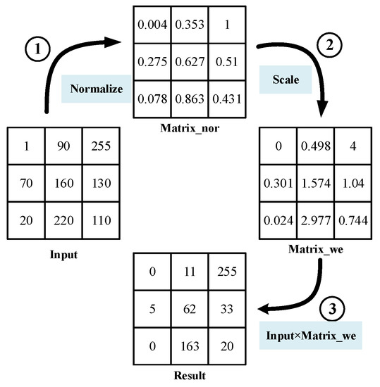 Salient points are related to the pixel amplitude. In relation to that, we had a simple idea that enhances the pixels with high amplitudes and suppresses other pixels. For the calculation process shown in Figure 4, the input example is a 3 × 3 two-dimensional matrix. Then, it is best to adopt a normalization operation. The next step is using the scaling function to adjust the weight value and generate a weight matrix. Finally, the product of the input matrix and the weight matrix is the output result.