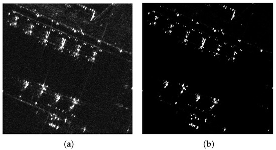 As shown in Figure 5a, we used a real SAR image, which has a lot of obvious background interference, to further explore the effectiveness of the method. We still enhanced the pixels with high amplitudes and suppressed other pixels, and the result is shown in Figure 5b. We can observe that the interference was significantly reduced, and we retained the main structure of the aircraft target.