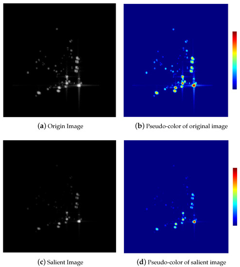 In Figure 6a, we show a simulated image of a SAR aircraft target, and its corresponding pseudo-color image is shown in Figure 6b. The pseudo-color image is based on the pixel amplitude for color mapping. The simulated image has no background interference, but there is interference from sidelobe energy leakage. We enhanced the salient points and suppressed other pixels. The result is shown in Figure 6c, and its corresponding pseudo-color image is shown in Figure 6d. This method can effectively suppress interference while retaining the main characteristics of the aircraft target.