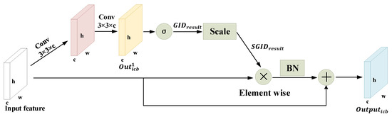 As shown in Figure 7, we first extract features by using a cascade of 3 × 3 convolutional layers . Second, we introduce GID with the support of sigmoid function to directly generate the weights of elements. Third, we employ a scale function to generate SGID for increasing the weights of salient points and decreasing the weights of redundant information. Then, we use SGID to enhance the scattering information by adjusting element values of input feature maps with element-wise operation. Last, the batch normalization (BN) and shortcut operation are employed. The precise equations are as follows: