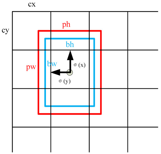 As shown in Figure 2, we use two-scale feature maps for prediction, and each scale layer uses 3 bounding boxes prior. We use k-means to calculate 6 bounding box priors and the results are (39 × 40), (76 × 69), (75 × 99), (109 × 102), (140 × 137), and (184 × 174). Each prediction box will include 4 bounding box offsets, 1 objectness prediction, and 1 class prediction. The detection uses logistic regression to predict the objectness score and employs an independent logistic classifier for class prediction. The calculation of a bounding box offset [14] is shown in Figure 8. The detection section predicts 4 coordinates for each bounding box, x, y, w, and h. The size of the prior box is by , and the size of the predicted box is by . The center of the predicted box is (, ). (, ) is the number of cells from the left top corner. The precise calculation is as follows.
