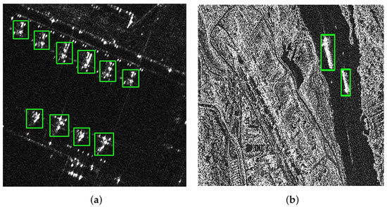 To verify the detection performance on other SAR targets, we also employed the SAR ship detection dataset (SSDD) [37], which includes 1160 images, which we divided into 928 images for training and 232 images for testing. One sample image in SSDD is shown in Figure 9b.